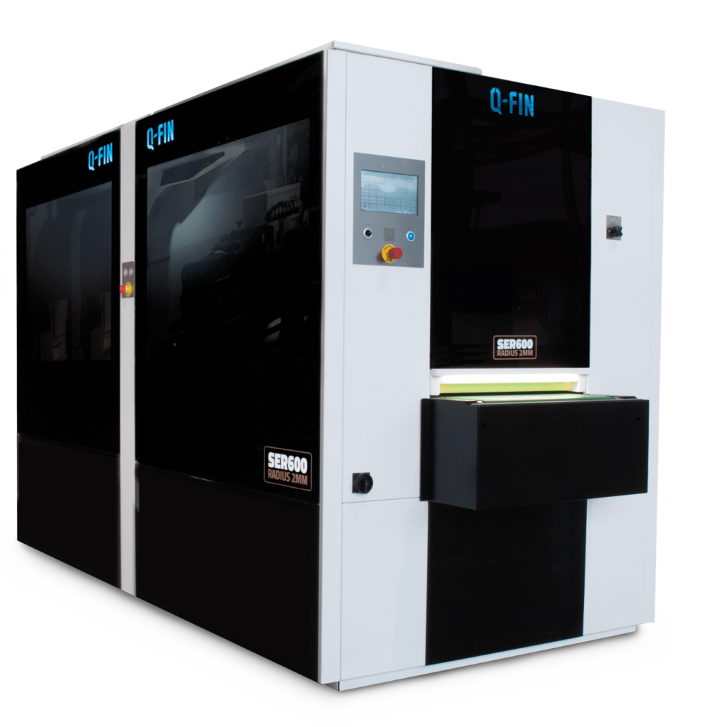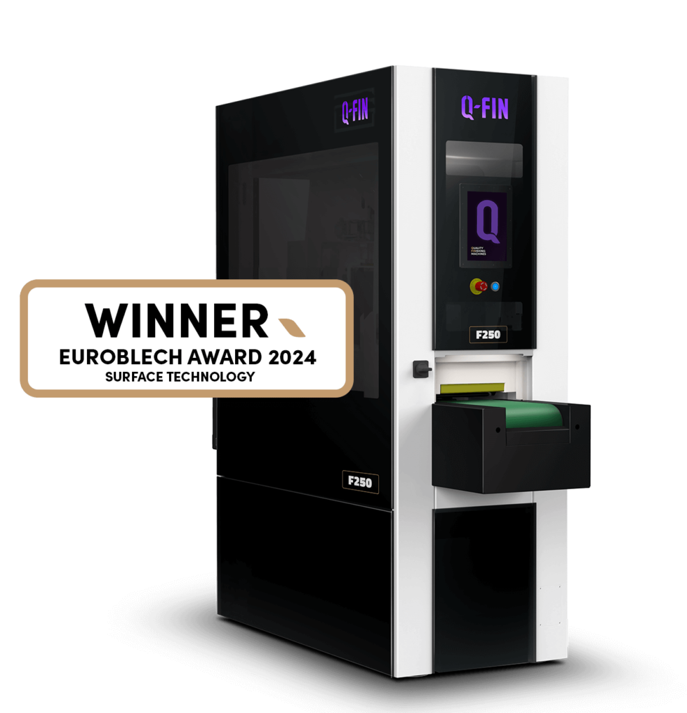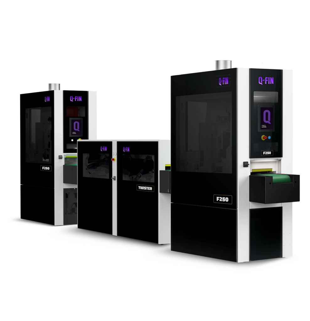 TwinLine Twister är en komplett konfiguration där två F250-maskiner och en vändningsenhet samverkar. Lösningen är idealisk för gradning och kantavrundning av små plåtdetaljer upp till 250 mm i bredd – på båda sidor och i ett enda genomlopp.