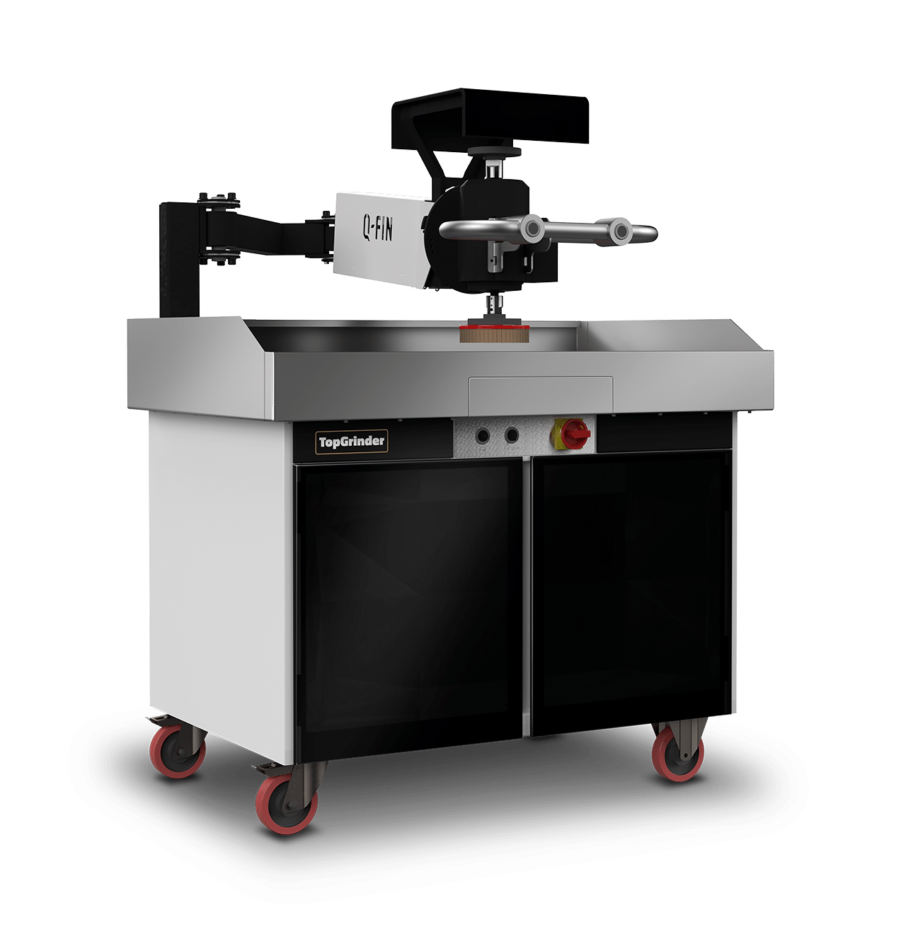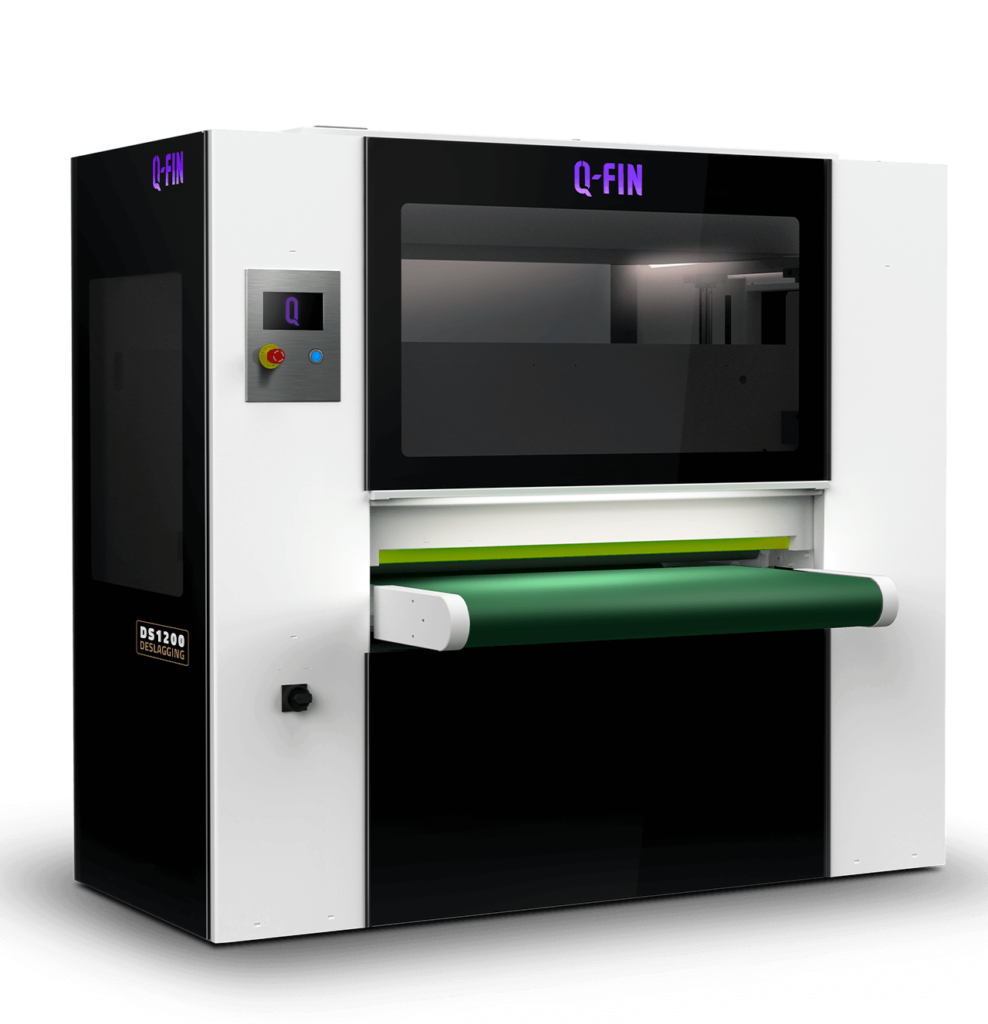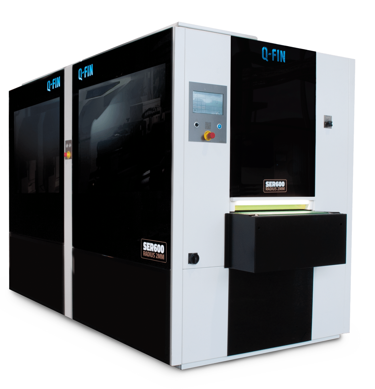 TwinLine Twister är en komplett konfiguration där två F250-maskiner och en vändningsenhet samverkar. Lösningen är idealisk för gradning och kantavrundning av små plåtdetaljer upp till 250 mm i bredd – på båda sidor och i ett enda genomlopp.